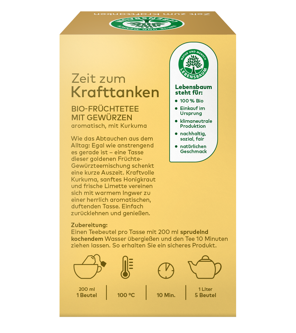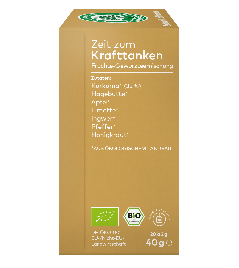 Wie das Abtauchen aus dem Alltag: Egal wie anstrengend es gerade ist – eine Tasse dieser goldenen Früchte- Gewürzteemischung schenkt eine kurze Auszeit. Kraftvolle Kurkuma, sanftes Honigkraut und frische Limette vereinen sich mit warmem Ingwer zu einer herrlich aromatischen, duftenden Tasse. Einfach zurücklehnen und genießen.