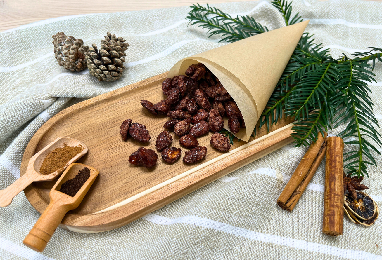 Zucker und Gewürze mit 100 ml Wasser in eine beschichtete Pfanne (keinen Topf!) geben und zum Kochen bringen, danach die Hitze reduzieren.