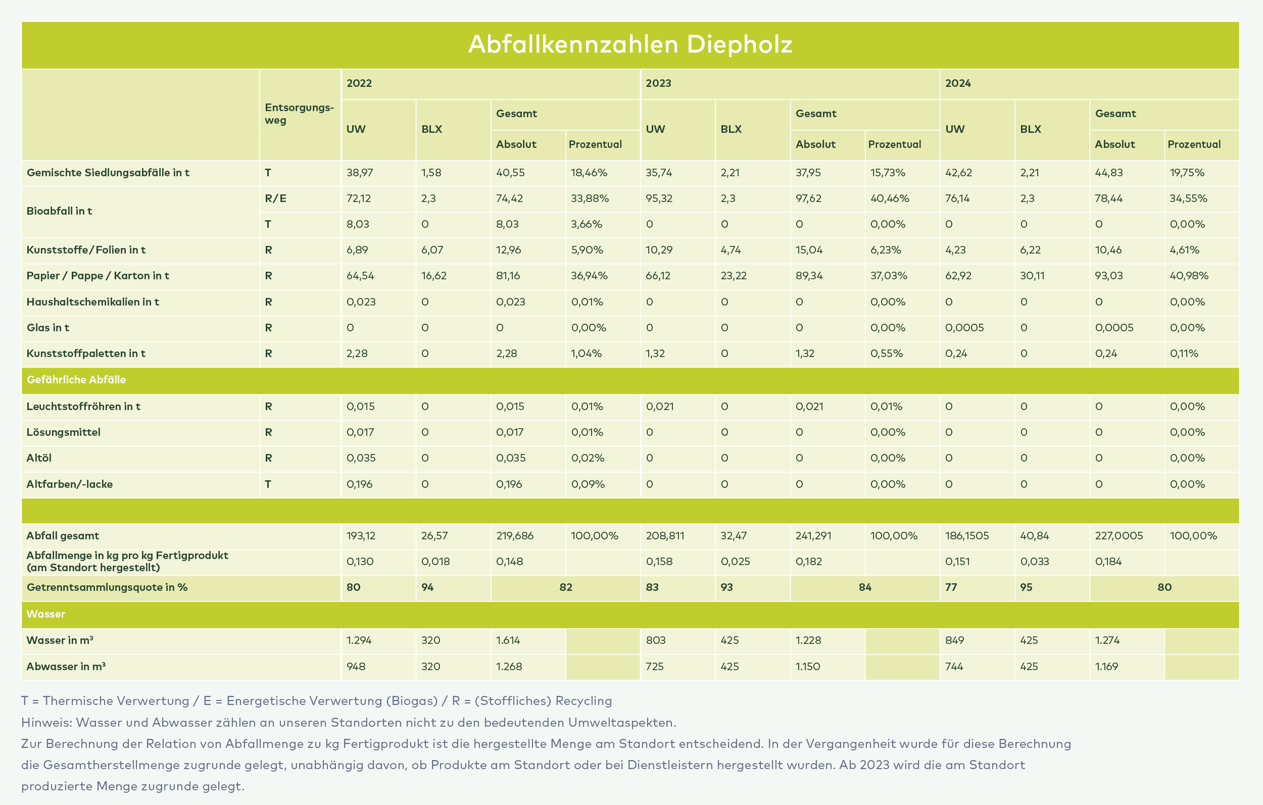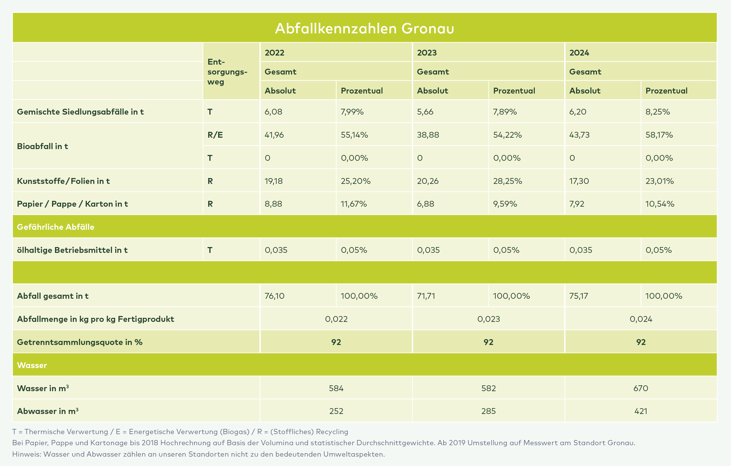 Die Getrenntsammlungsquote liegt auf Ebene der Unternehmensgruppe bei rund 83 %. Das von uns beauftrage Entsorgungsunternehmen weist uns nach, dass eine Nachtrennung von mindestens 85 % erfolgt und wir damit auch die gesetzlich geforderten Quoten erreichen. Sondermüll und gefährliche Abfälle gibt es an beiden Standorten nur unregelmäßig und dann in sehr geringen Mengen. Selbstverständlich wurde alles zwecks Recyclings oder fachgerechter Entsorgung den entsprechenden Fachbetrieben übergeben.
