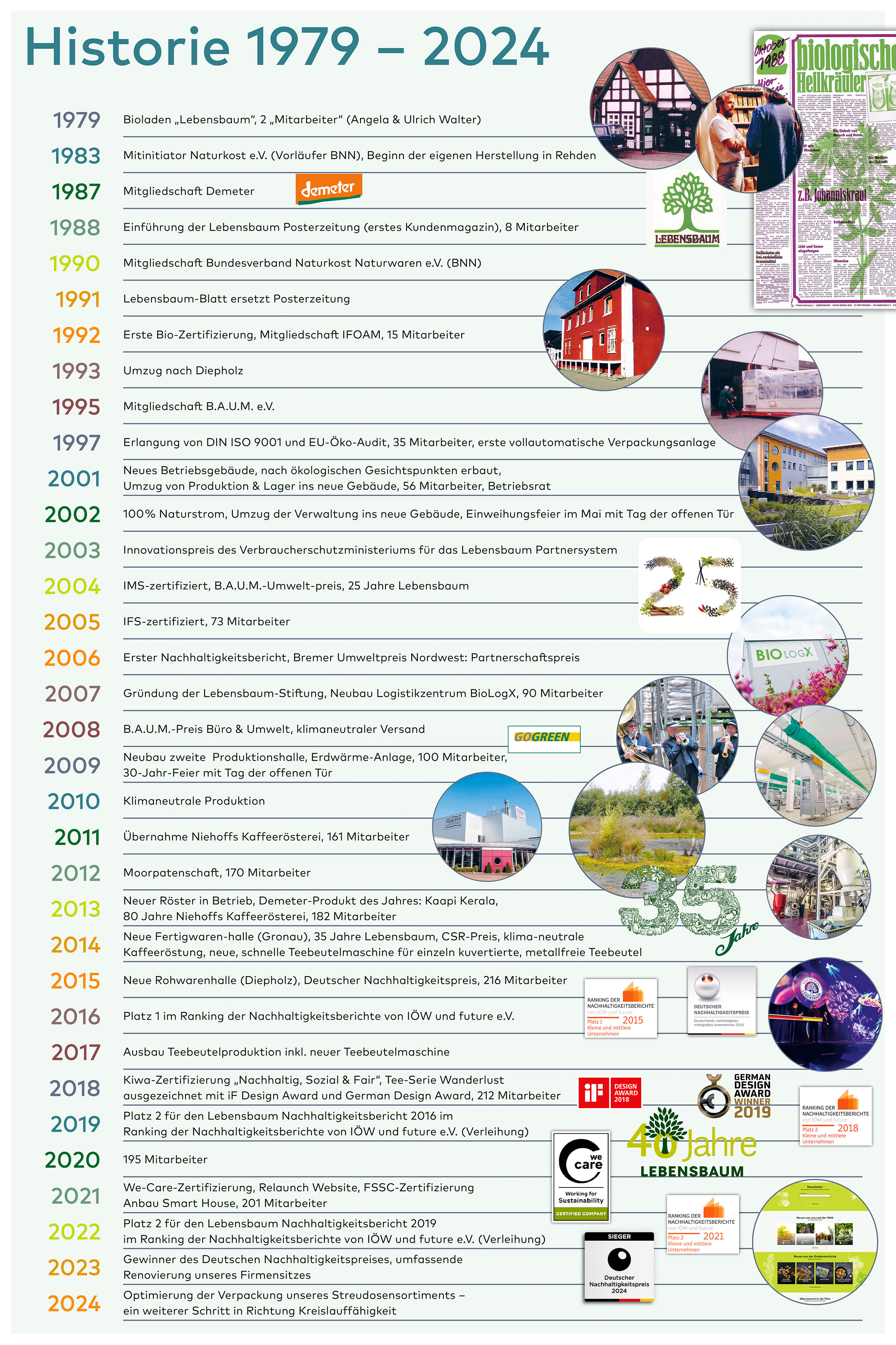 Im Sommer 1979 übernimmt Unternehmensgründer Ulrich Walter einen Bioladen in der norddeutschen Kleinstadt Diepholz. Schnell muss er feststellen: Tee, Kaffee und Gewürze in Bioqualität gibt es nicht. Also macht er sich auf die Suche. Seine Reisen führen ihn nach Südfrankreich, Ägypten und später bis nach Indien. Aus dem kleinen Bioladen LEBENSBAUM wird ein mittelständisches Unternehmen, das sich auf die Herstellung von Tee, Kaffee und Gewürzen in Bioqualität spezialisiert. Die Rohwaren bezieht LEBENSBAUM nach wie vor direkt von seinen Anbaupartnern. Das ermöglicht eine sorgfältige Zutatenauswahl und garantiert den guten Geschmack der Produkte. Geschmacksverstärker und Zusatzstoffe verwendet LEBENSBAUM grundsätzlich nicht.