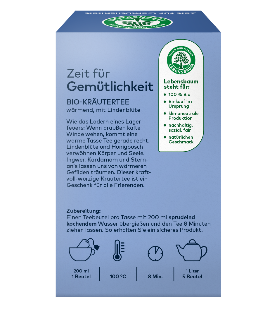 Wie das Lodern eines Lagerfeuers: Wenn draußen kalte Winde wehen, kommt eine warme Tasse Tee gerade recht. Lindenblüte und Honigbusch verwöhnen Körper und Seele. Ingwer, Kardamom und Sternanis lassen uns von wärmeren Gefilden träumen. Dieser kraftvoll- würzige Kräutertee ist ein Geschenk für alle Frierenden.