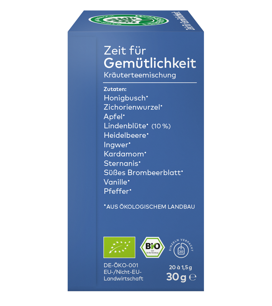 Honigbusch*, Zichorienwurzel*, Apfel*, Lindenblüte* (10 %), Heidelbeere*, Ingwer*, Kardamom*, Sternanis*, Süßes Brombeerblatt*, Vanille*, Pfeffer*
