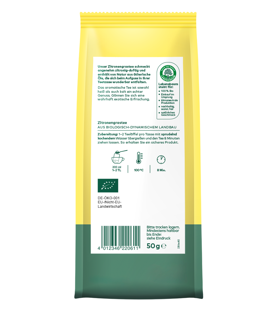 Unser Zitronengras schmeckt angenehm zitronig-duftig und enthält von Natur aus ätherische Öle, die sich beim Aufguss in Ihrer Teetasse wunderbar entfalten. Wir beziehen das Zitronengras aus Ägypten von unserem langjährigen Partner, der es für uns biologisch-dynamisch anbaut, sorgfältig erntet und trocknet. Gönnen Sie sich eine wahrhaft exotische Erfrischung.