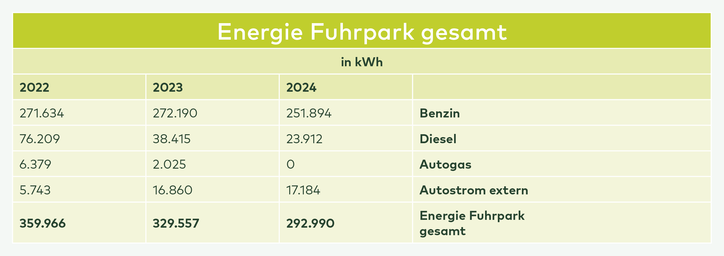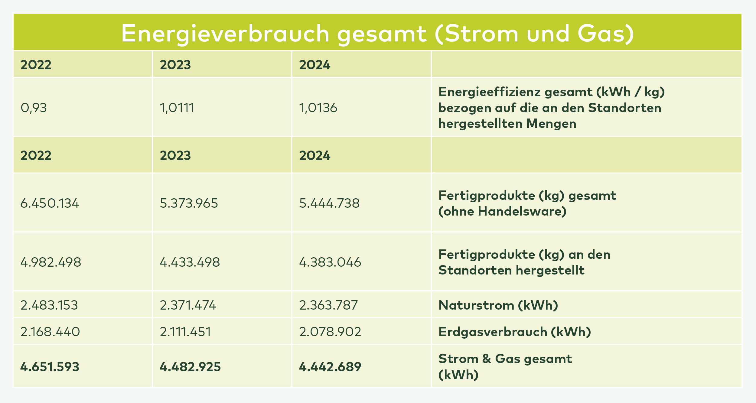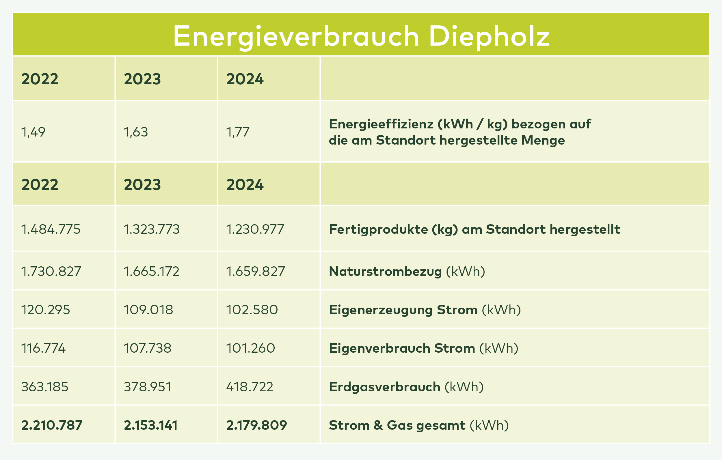 Der Verbrauch von Strom und Gas hat sich an den Standorten unterschiedlich entwickelt. Was den Stromverbrauch angeht, so ist sowohl für Diepholz als auch für Gronau ein stabiles Niveau zu erkennen: In Diepholz ist der Stromverbrauch um 0,7 % zum Vorjahr gesunken, in Gronau um 0,9 % gestiegen. Dies lässt sich für beide Standorte mit der Produktionsmenge erklären. Der Gasverbrauch hingegen ist in Diepholz im Vergleich zum Vorjahr um 10,5 % angestiegen. In Gronau hingegen ist der Gasverbrauch um 4,2 % geringer als im Vorjahr. Die Energieef¬fizienz, die sich aus kWh pro hergestellte Menge ergibt, ist in Diepholz gestiegen und in Gronau leicht gesunken. Insgesamt liegt sie für die Unternehmensgruppe minimal unter dem Vorjahresniveau. Ergänzend zum Strom- und Gasverbrauch kommt der Kraftstoffverbrauch für die Firmenfahrzeuge hinzu, der insgesamt um rund 11 % gesunken ist. Dies ist auf eine fortschreitende Elektrifizierung der Firmenfahrzeuge zurückzuführen.