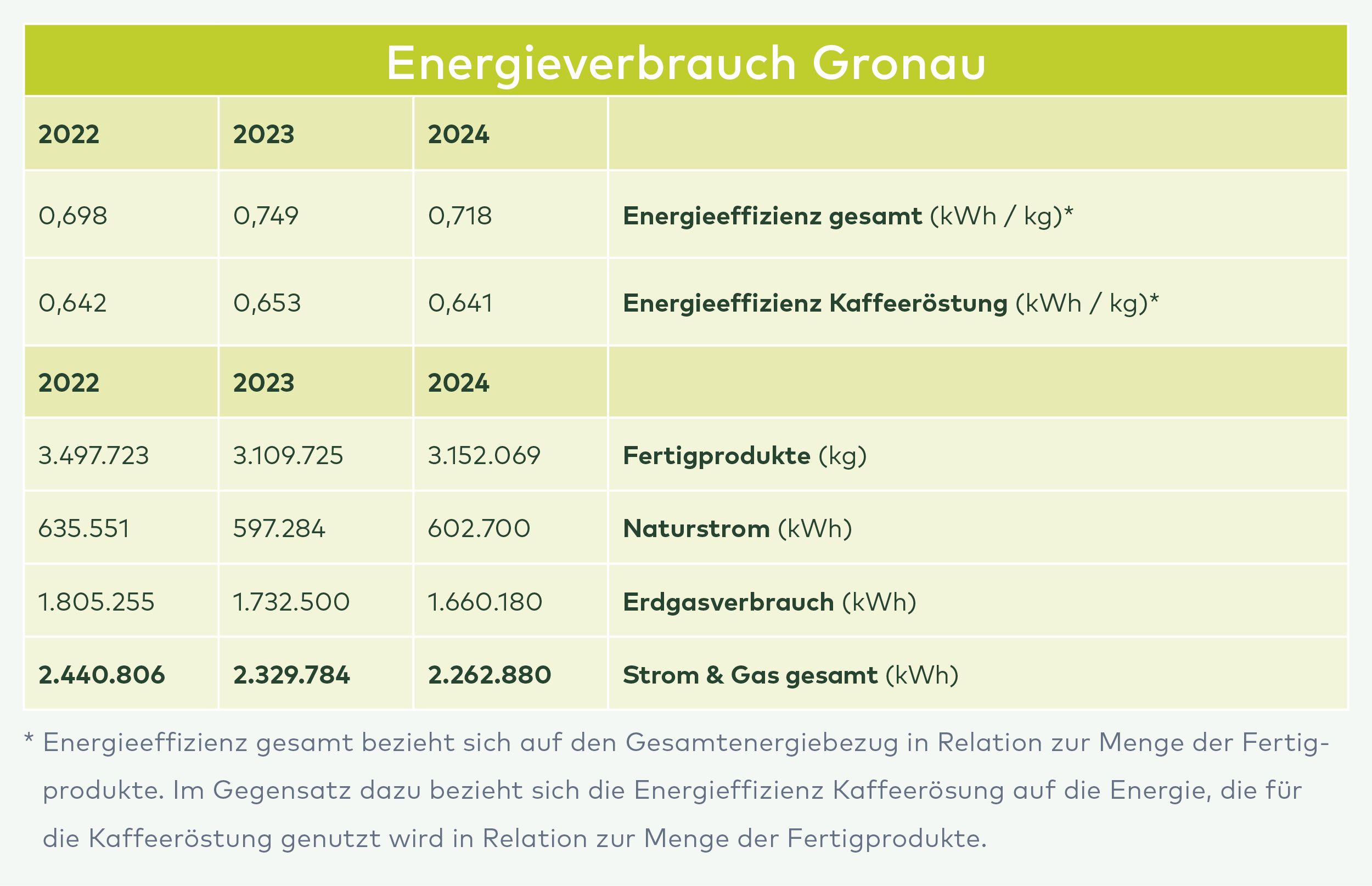 Der größte Posten für den Energieverbrauch in Gronau ist der Röster, auch wenn er deutlich effizienter ist als sein Vorgänger. Die Energieintensität bei der Kaffeeherstellung hat im letzten Jahr leicht abgenommen.