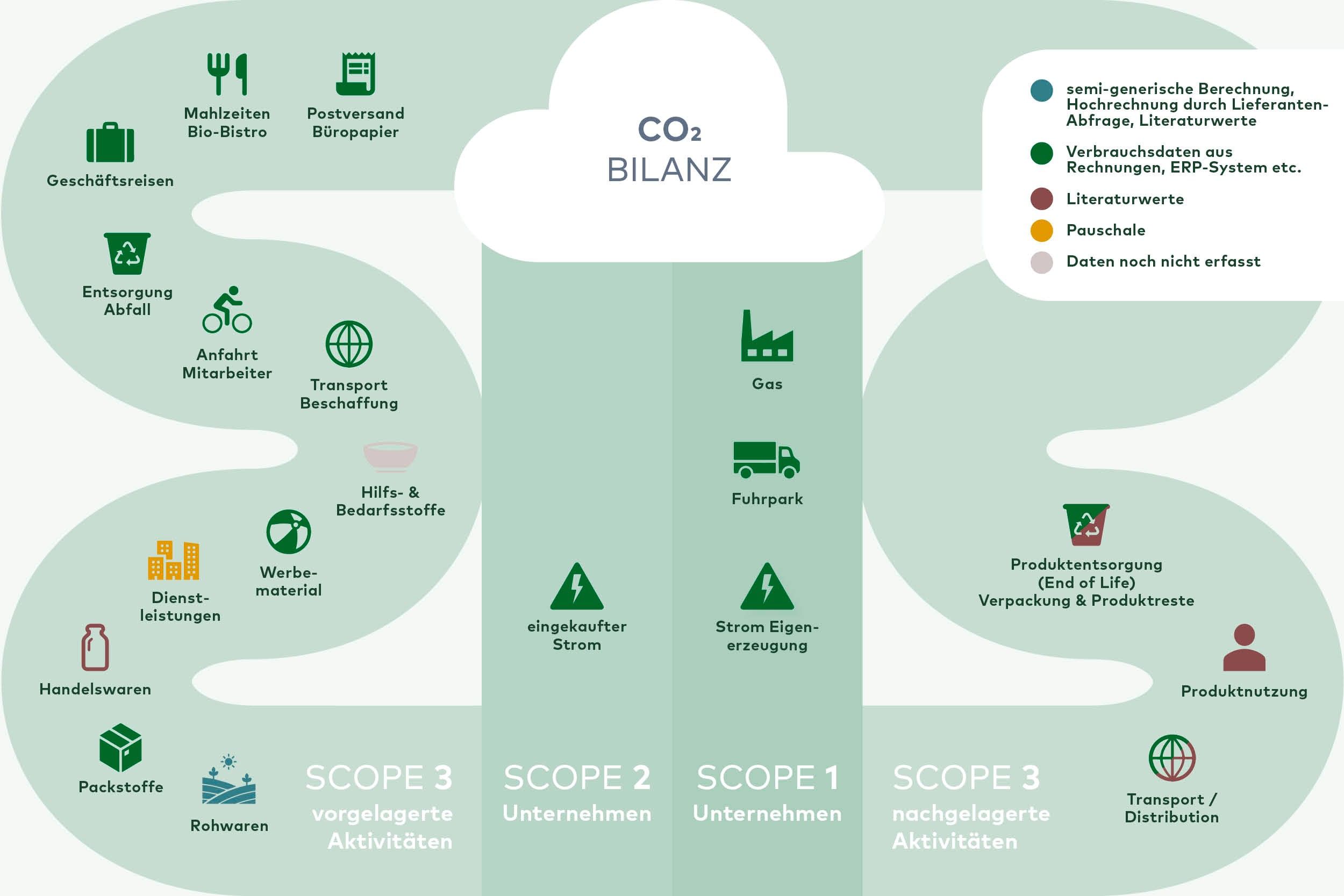 Das Greenhouse-Gas-Protocol – der internationale Standard zur Berechnung von Treibhausgasemissionen – teilt die Emissionen eines Unternehmens in verschiedene Bereiche (engl. Scopes) ein. Dabei wird unterschieden, ob Emissionen direkt im Unternehmen oder außerhalb entstehen, beziehungsweise wie unmittelbar sie dem Unternehmen zugeordnet werden können.