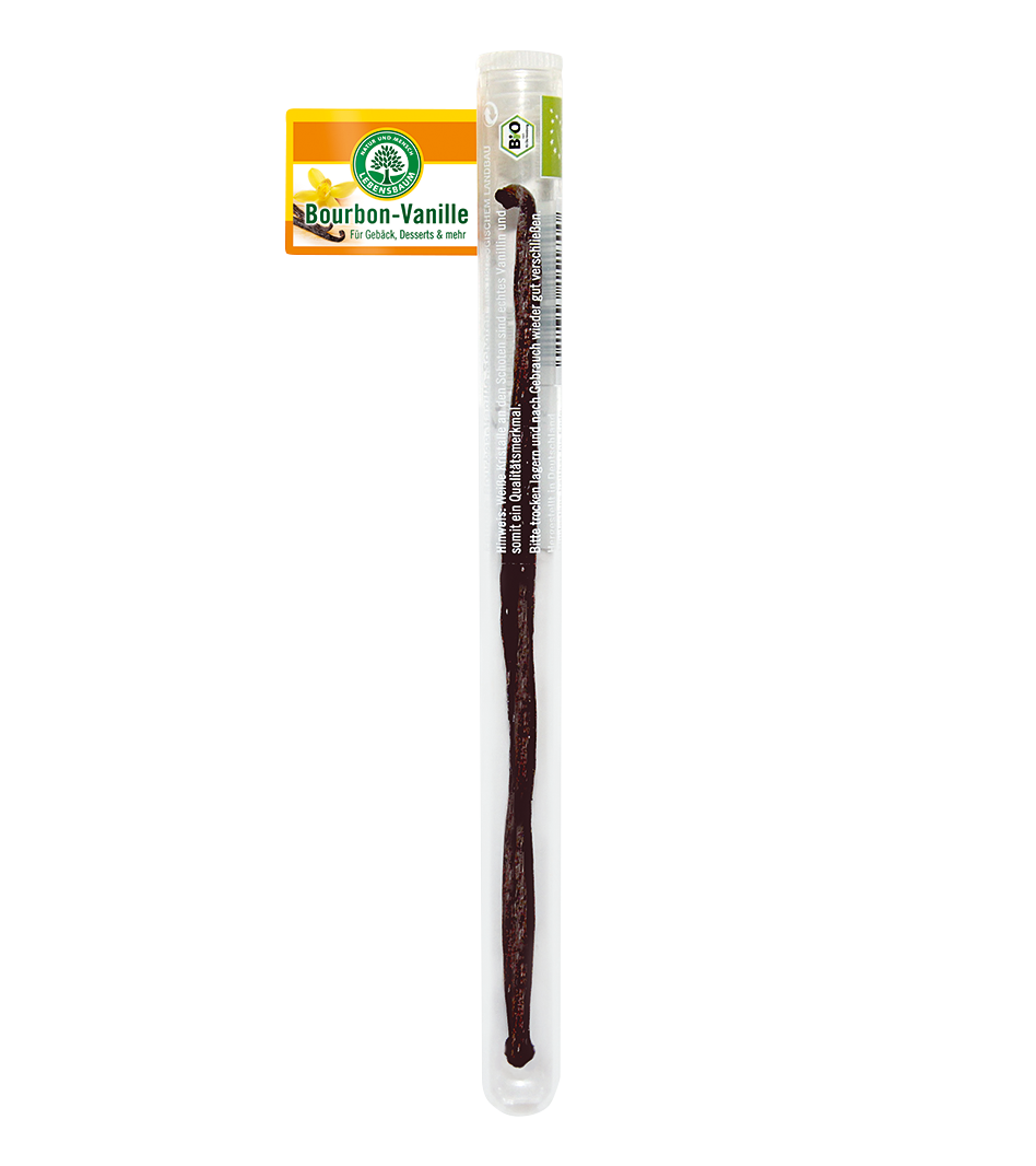 Unsere Bourbon-Vanille beziehen wir aus Madagaskar. Dort wachsen die Orchideen im Urwald heran. Kleinbauern übernehmen den aufwändigen Anbau und oft auch die Verarbeitung. Zur Befruchtung der Orchideen wird mit einer Nadel ein kleines Häutchen vor dem Stempel der Blüte durchstochen. Dann werden Narbe und Staubbeutel aufeinandergedrückt. Ungeübte Hände verzweifeln. Geübte schaffen bis zu 1.200 Blüten am Tag. Aus jeder befruchteten Blüte entsteht innerhalb von sechs bis acht Monaten eine bis zu 20 cm lange grüne Kapsel, oft auch als Schote bezeichnet. Kurz bevor sie anfängt zu reifen und ihre Farbe von Grün zu Gelb wechselt, werden die Kapseln einzeln von Hand geerntet. Ihre endgültige braun-schwarze Färbung erhalten die Schoten durch einen mehrmonatigen Fermentations- und Trocknungsprozess.