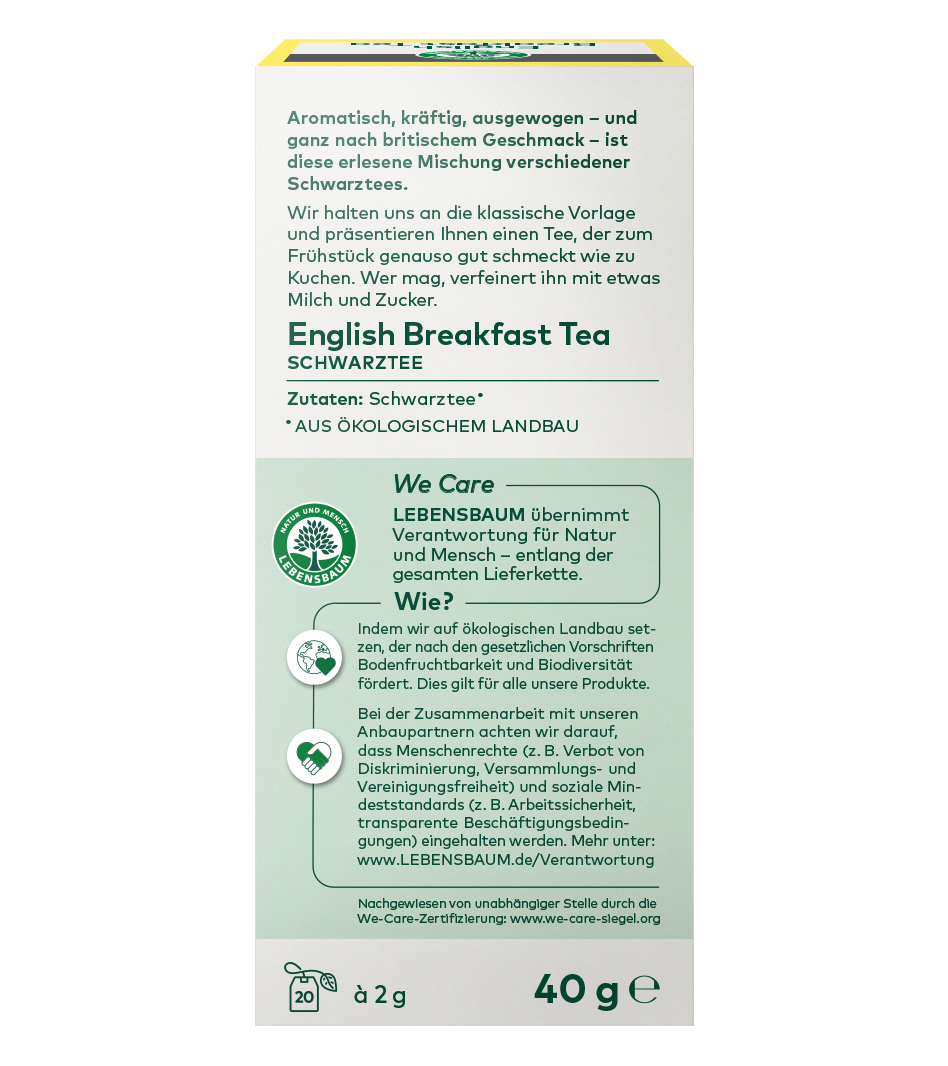 Ausgewogen - und sehr britisch - so schmeckt unser English Breakfast Tea. Die traditionelle Mischung indischer Schwarztees zeichnet sich durch eine rotbraune Tassenfarbe aus. In Indien ließen die Engländer diesen Tee ganz nach ihrem Geschmack anbauen und veredeln. Auch wir halten uns an die klassische Vorlage und präsentieren Ihnen einen Tee, der zum Frühstück genauso gut schmeckt wie zu Kuchen. Wer mag, verfeinert ihn mit etwas Milch und Zucker.