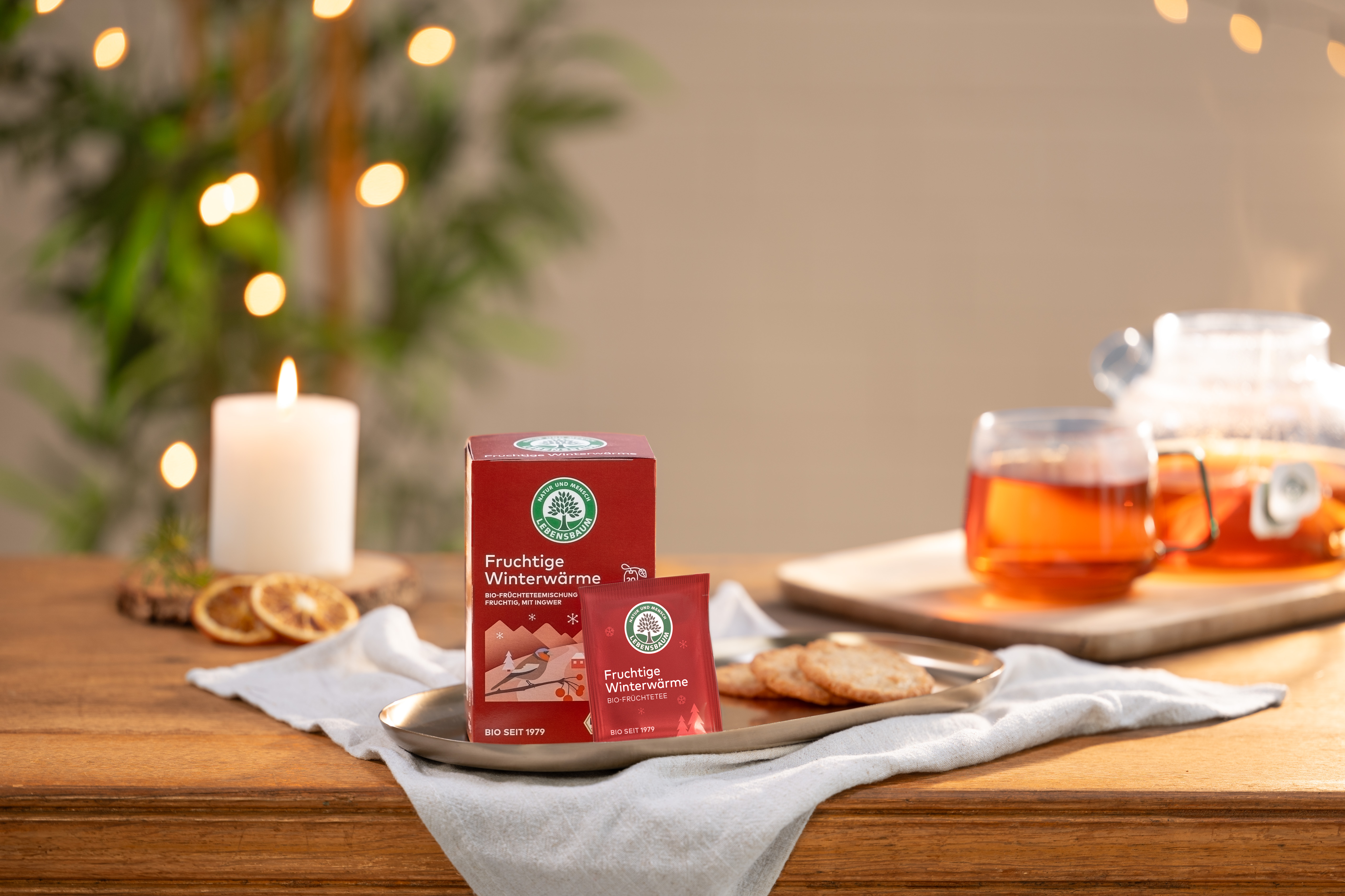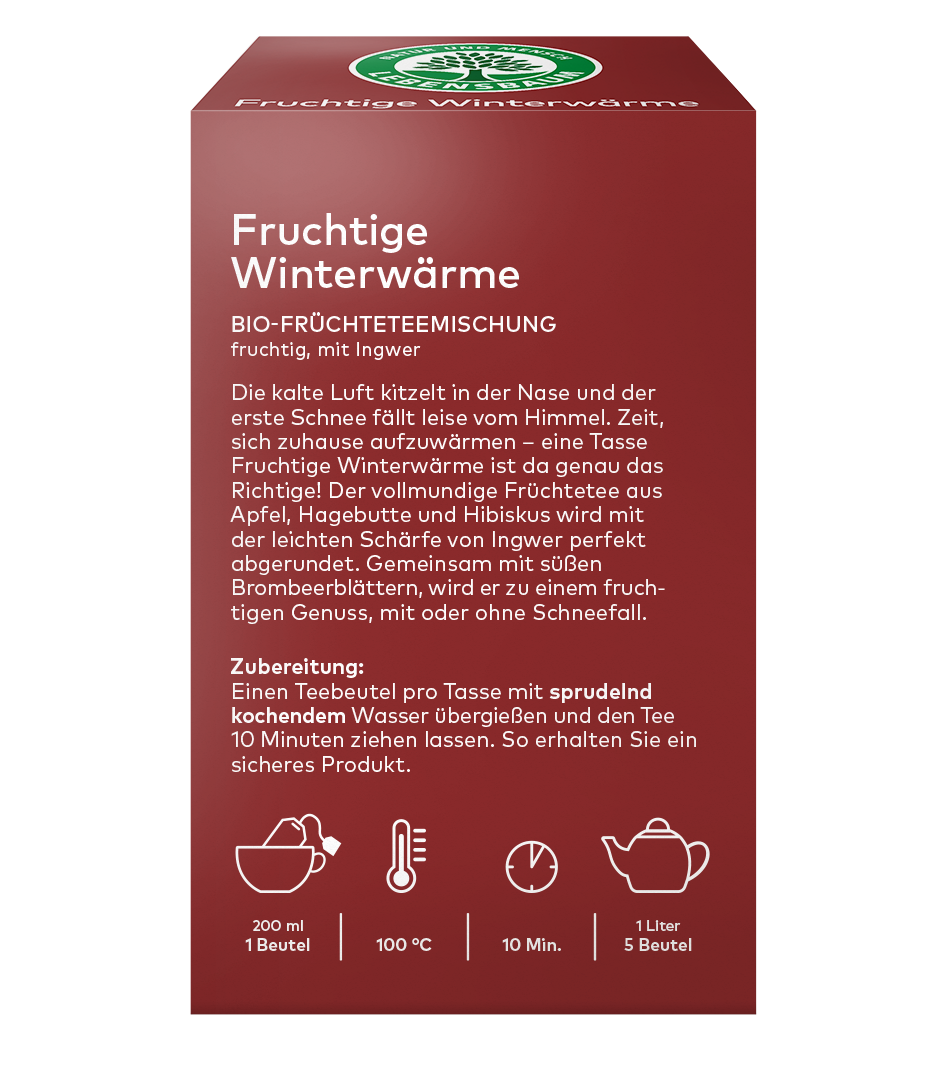 Die kalte Luft kitzelt in der Nase und der erste Schnee fällt leise vom Himmel. Zeit, sich zuhause aufzuwärmen – eine Tasse Fruchtige Winterwärme ist da genau das Richtige! Der vollmundige Früchtetee aus Apfel, Hagebutte und Hibiskus wird mit der leichten Schärfe von Ingwer perfekt abgerundet. Gemeinsam mit süßen Brombeerblättern, wird er zu einem fruchtigen Genuss, mit oder ohne Schneefall.