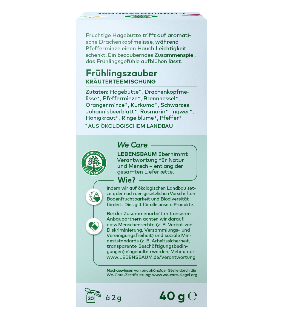 Fruchtige Hagebutte trifft auf aromatische Drachenkopfmelisse, während Pfefferminze einen Hauch Leichtigkeit schenkt. Ein bezauberndes Zusammenspiel, das Frühlingsgefühle aufblühen lässt.
