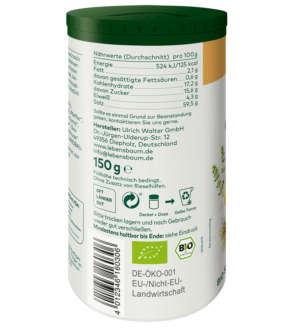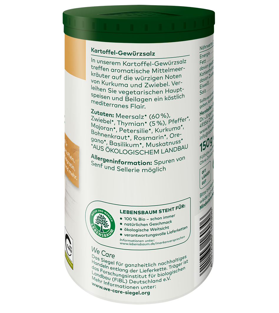 In unserem Kartoffel-Gewürzsalz treffen aromatische Mittelmeerkräuter auf die würzige Note von Kurkuma und Zwiebel. Verleihen Sie vegetarischen Hauptspeisen und Beilagen ein köstlich mediterranes Flair.