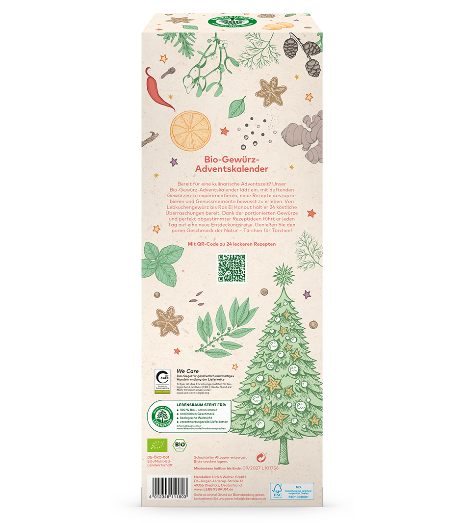 Unser Bio-Gewürz-Adventskalender lädt ein, mit duftenden Gewürzen zu experimentieren, neue Rezepte auszuprobieren und Genussmomente bewusst zu erleben. Von Lebkuchengewürz bis Ras El Hanout hält er 24 köstliche Überraschungen bereit. Dank der portionierten Gewürze und perfekt abgestimmter Rezeptideen führt er jeden Tag auf eine neue Entdeckungsreise. Genießen Sie den puren Geschmack der Natur - Türchen für Türchen!