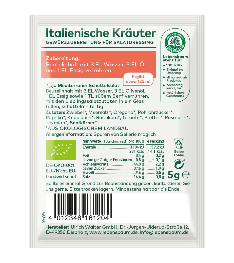 Die großen Fünf der Mittelmeerküche – Oregano, Basilikum, Majoran, Rosmarin und Thymian – entfalten in diesem Salatdressing ihre kraftvoll-würzigen Aromen. Ideal für Blatt- und Nudelsalate und natürlich für einen Panzanella, den italienischen Brotsalat.