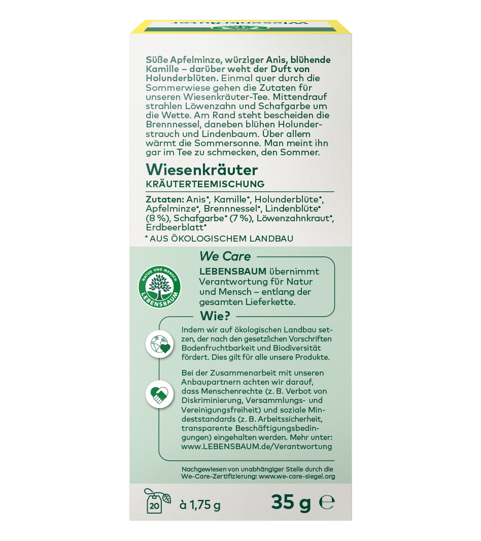Süße Apfelminze, würziger Anis, blühende Kamille – darüber weht der Duft von Holunderblüten. Einmal quer durch die Sommerwiese gehen die Zutaten für unseren Wiesenkräuter Tee. Mittendrauf strahlen Löwenzahn und Schafgarbe um die Wette. Am Rand steht bescheiden die Brennnessel, daneben blühen Holunderstrauch und Lindenbaum. Über allem wärmt die Sommersonne. Man meint ihn gar im Tee zu schmecken, den Sommer.