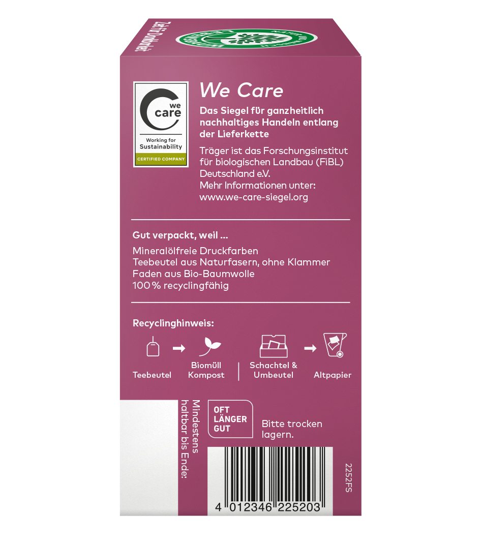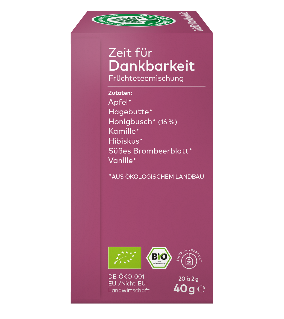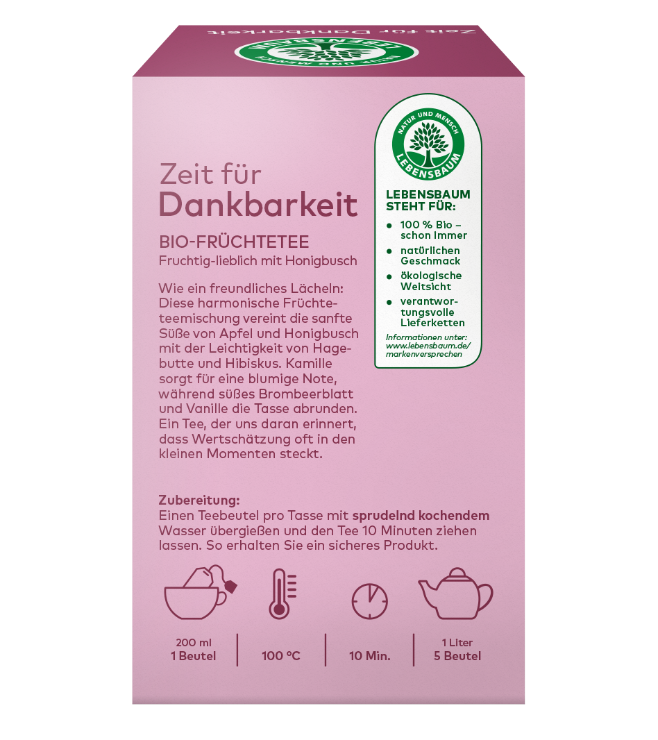 Wie ein freundliches Lächeln: Diese harmonische Früchteteemischung vereint die sanfte Süße von Apfel und Honigbusch mit der Leichtigkeit von Hagebutte und Hibiskus. Kamille sorgt für eine blumige Note, während süßes Brombeerblatt und Vanille die Tasse abrunden. Ein Tee, der uns daran erinnert, dass Wertschätzung oft in den kleinen Momenten steckt.