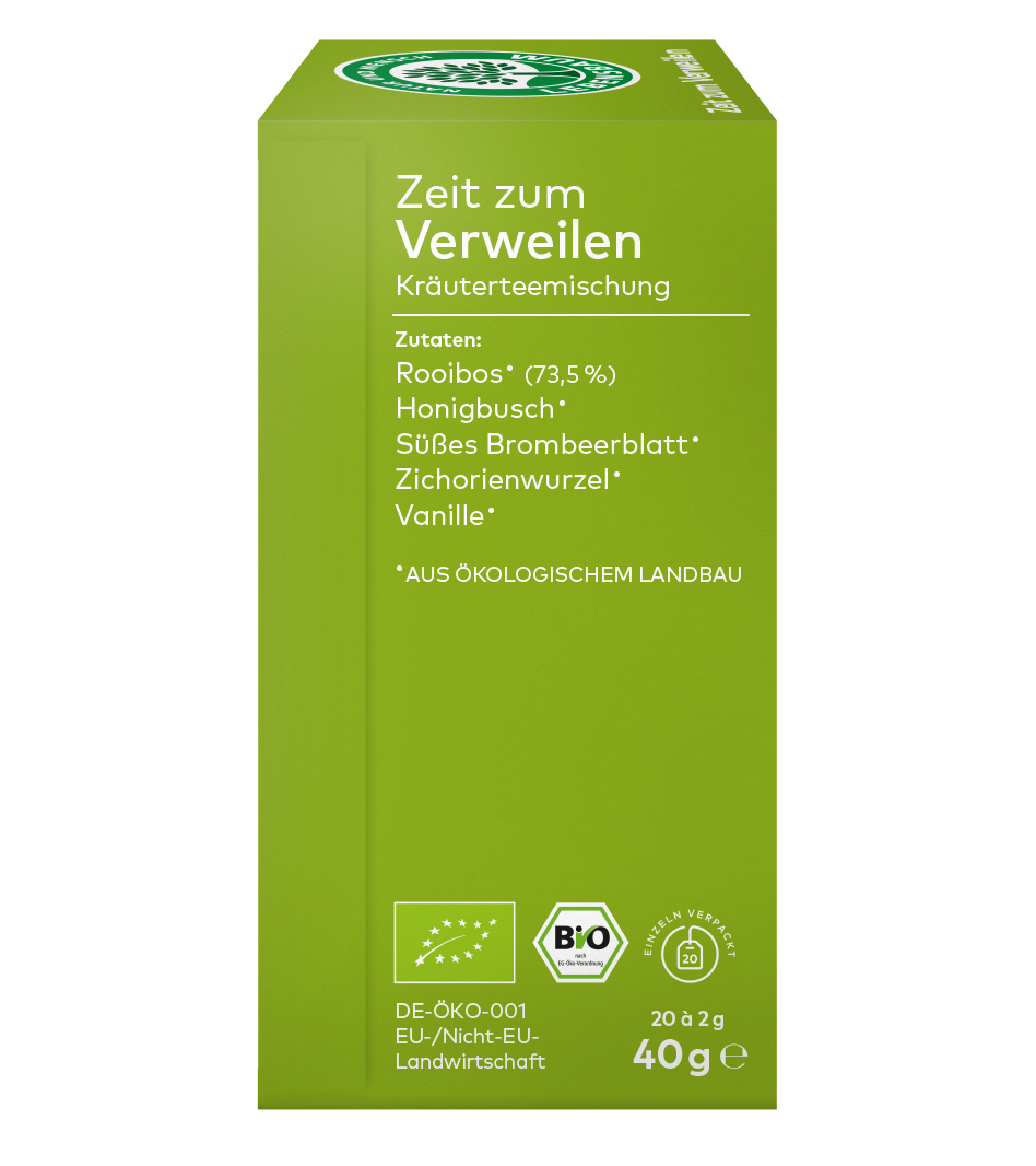 Wie ein Moment der Ruhe inmitten des Tages: Diese sanfte Kräuterteemischung lädt dazu ein, innezuhalten. Rooibos und Honigbusch verleihen eine warme Basis, während süßes Brombeerblatt, Vanille und Zichorienwurzel eine leichte Süße beisteuern. Manchmal braucht es nur eine Tasse Tee, um den Augenblick vollkommen zu machen.