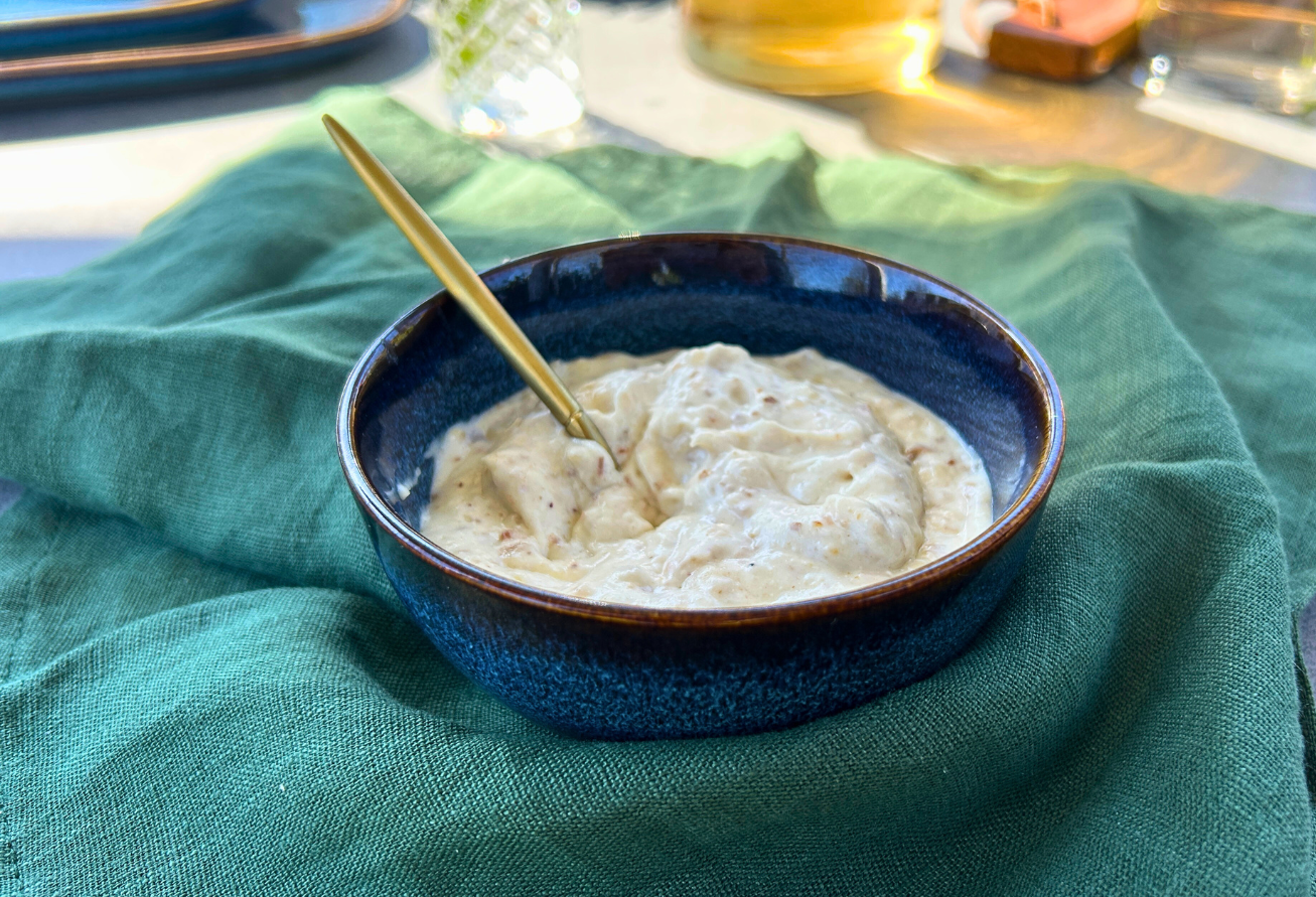 In der Zwischenzeit Frischkäse, Mayonnaise und Cumin Koriander Muskatnuss in einer Schüssel glattrühren.